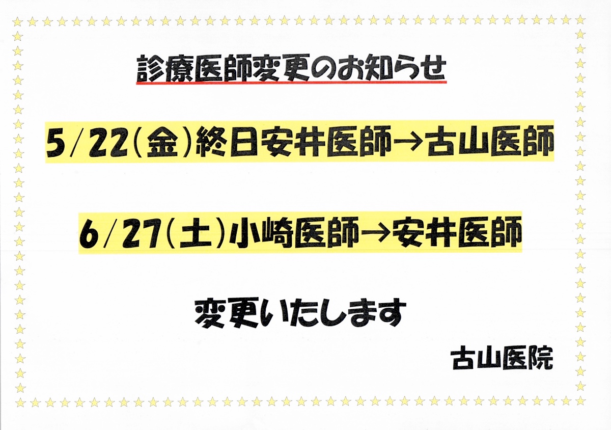 診療医師変更のお知らせ:5/22(金)、6/27(土)